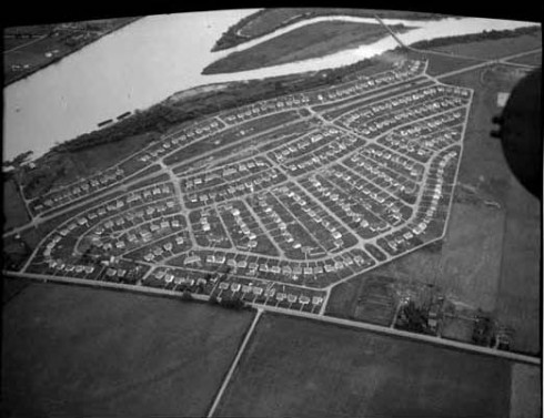 All street names are based on the names of aircraft, and the main street is, not surprisingly, “Boeing”. Examples of other street names are: Catalina, Douglas, Handley, Anson, Hudson, Wellington, Stirling, and Lancaster. Architects McCarter & Nairn developed the design of the community, including the layout of the roads, sewers, pumping system and other services. It was designed with differing sized lots and curving roads to avoid a checker board appearance. (The Boeing Beam, Vol 1, No 10, May 12, 1943). Each house on its 50 x 100 foot lot was designed to provide the maximum allowed living space with ample fenestration and storage. All houses were between 700 and 900 sq. ft and had either 4 or 6 rooms. Each house fell into 1 of 3 designs, had 1 of 4 roof colours and 1 of 3 wall colours. [City of Richmond]