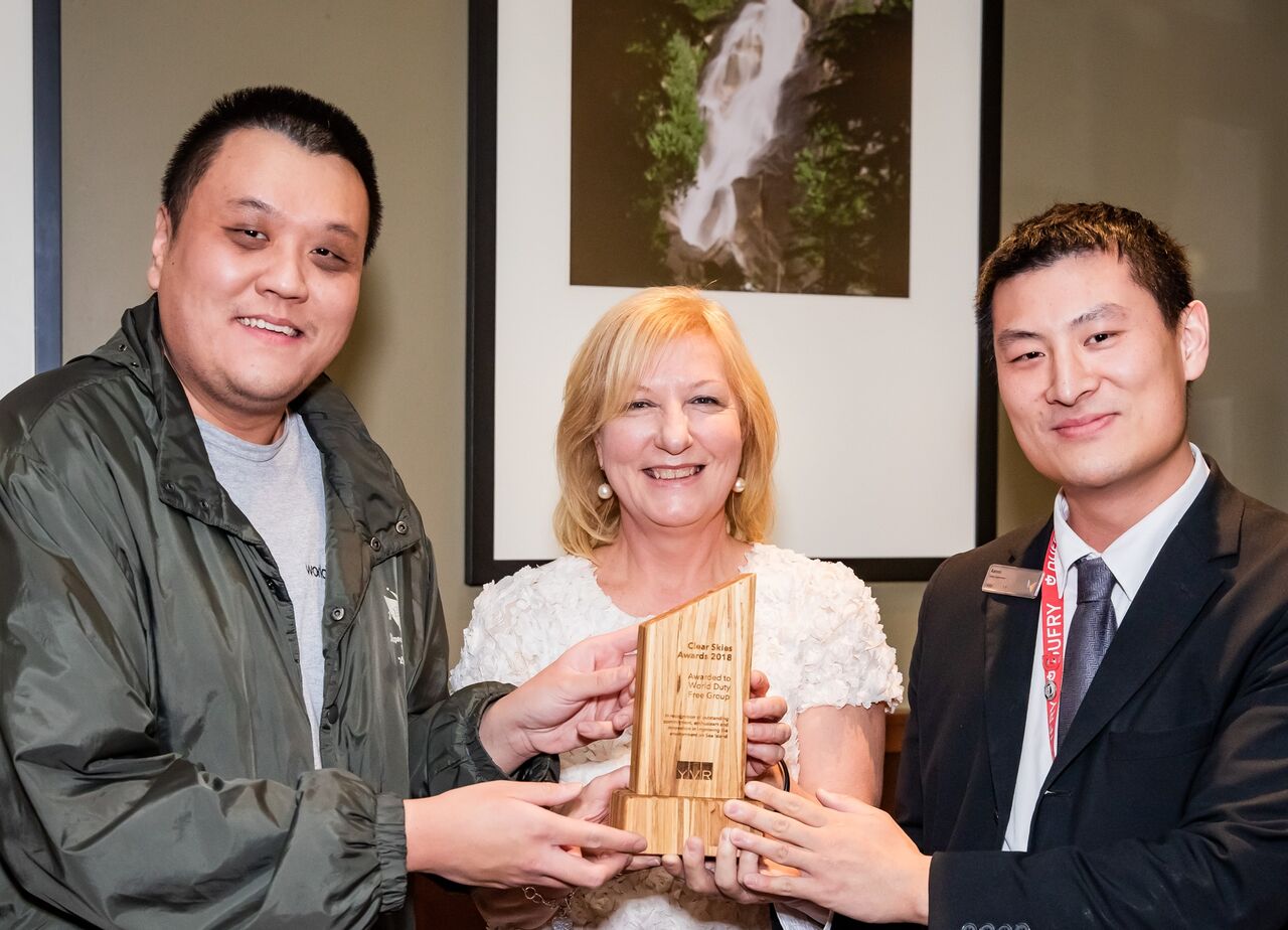 Tony Zhai and Aaron Cheung accepted the 2018 Clear Skies Award, in-terminal category, on behalf of World Duty Free. Seen here with Marion Town, director of environment at YVR.